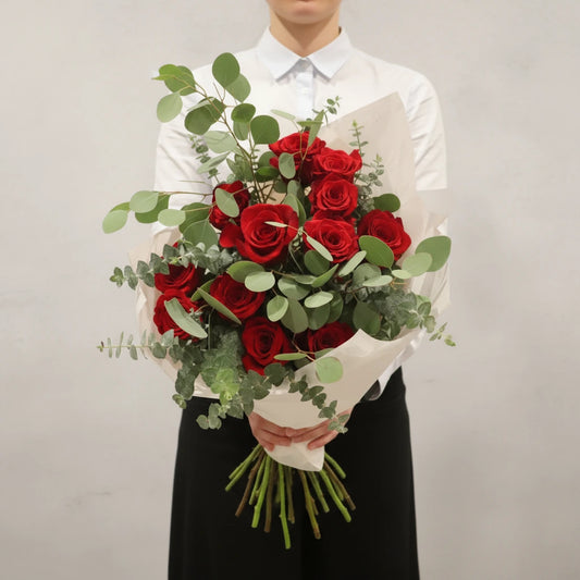 Romantic and charming. Pink roses convey admiration, sweetness, and gratitude. This premium bouquet of 12 long-stemmed roses, with a luxurious texture, is perfect for moments of affection, love, or celebration. Includes a QR React card for a shared emotional experience.